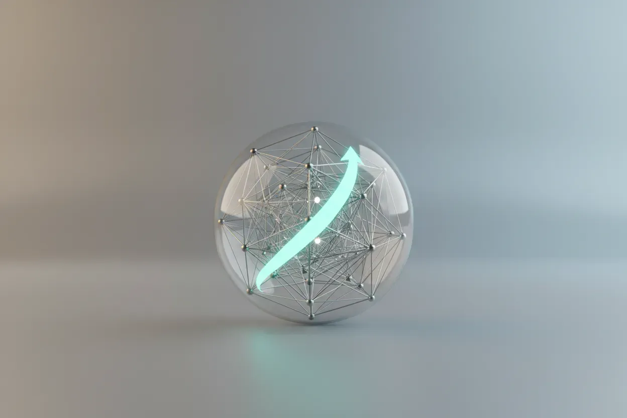 Minimalist glass sphere with a glowing network node and an upward light ribbon on a soft neutral gradient background.