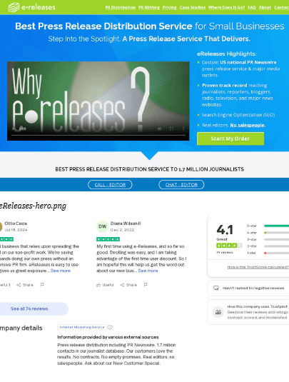 eReleases offers pricing from $299-$599 per release with PR Newswire access and human editorial review. The platform maintains 4.6-4.8/5 Trustpilot ratings, with customers citing personalized editorial guidance as a key differentiator.