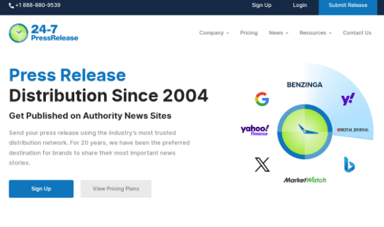 24-7 Press Release maintains 20+ years of operational history with a 4.7/5 Capterra rating. Pricing begins at $89, offering user-friendly platform design and straightforward service.