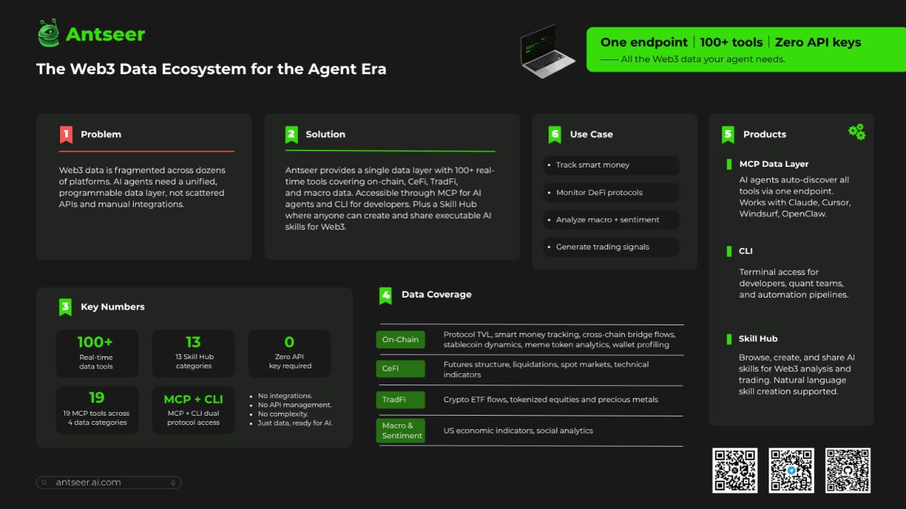Through the MCP Data Layer, Antseer unifies on-chain, off-chain, and market data into a standardized interface, enabling agents to access real-time data natively.