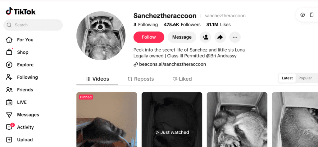 Sanchez, along with another raccoon named Luna, has built a large following online through entertaining and family-friendly videos shared under @sancheztheraccoon.