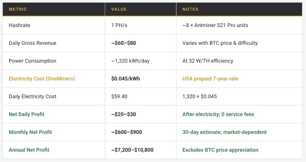 To understand the profitability on offer, it helps to look at the baseline mathematics of a real mining operation. Based on live network data and representative hardware efficiency ratings for 2026-generation ASIC miners, a 1 PH/s operation — roughly eight Antminer S21 Pro units — produces the following results when hosted at OneMiners’ USA facility at $0.045/kWh: