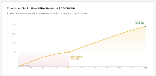 Modelling a $20,000 hardware investment hosted at OneMiners’ USA facility, the breakeven point arrives at roughly 10 to 12 months. After that point, the operation generates pure net profit. Over a 36-month horizon, the modelled operation returns approximately $46,000 net on a $20,000 hardware investment — a 230% return, and that excludes any Bitcoin price appreciation.