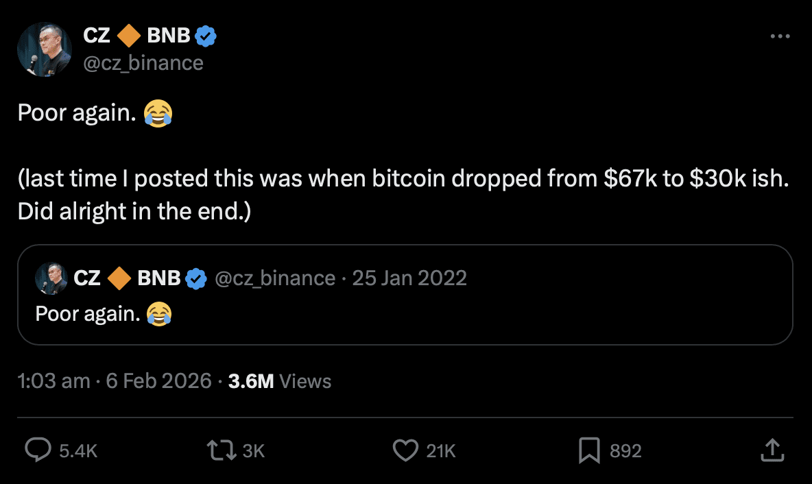 CZ doesn’t post “Poor again” randomly. He posted it in 2022 when Bitcoin hit $30K during peak fear, and that became the bottom. Now he posts it again at $60K, and Bitcoin immediately rebounds. The pattern is clear. This isn’t just a meme, it’s a signal that smart money recognizes: fear marks the bottom, and the next move is up.