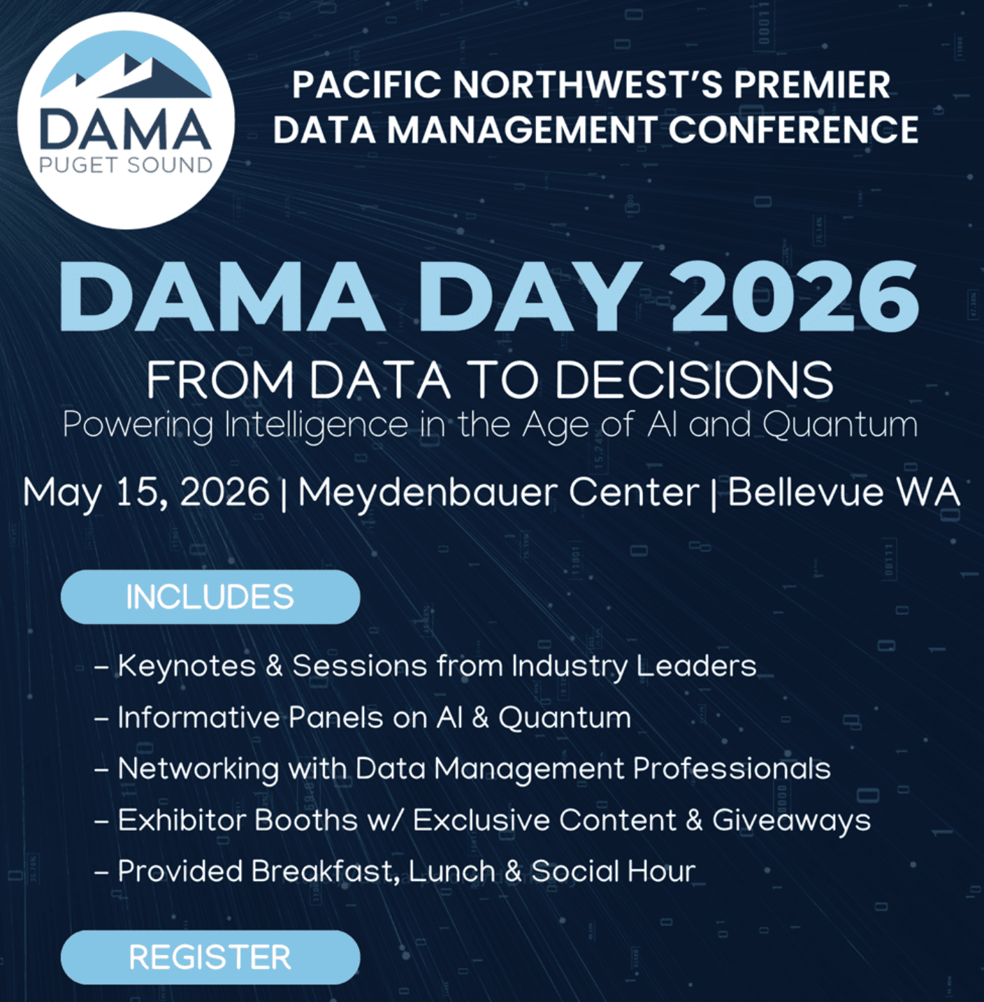 Registrations are currently open, and the chapter is actively seeking sponsors, speakers, and volunteers to help make the event a success. Data professionals across the Tri-City area, greater Seattle, Bellevue, Redmond, and the broader Puget Sound area are encouraged to register early and take advantage. Whether you are a seasoned data leader navigating the complexities of AI governance or an emerging professional looking to build your network and sharpen your skills, DAMA Day 2026 offers a rare opportunity to learn from the best, connect with peers, and shape the future of data-driven decision-making in the region. Learn more about DAMA Day here: https://dama-ps.org/damaday