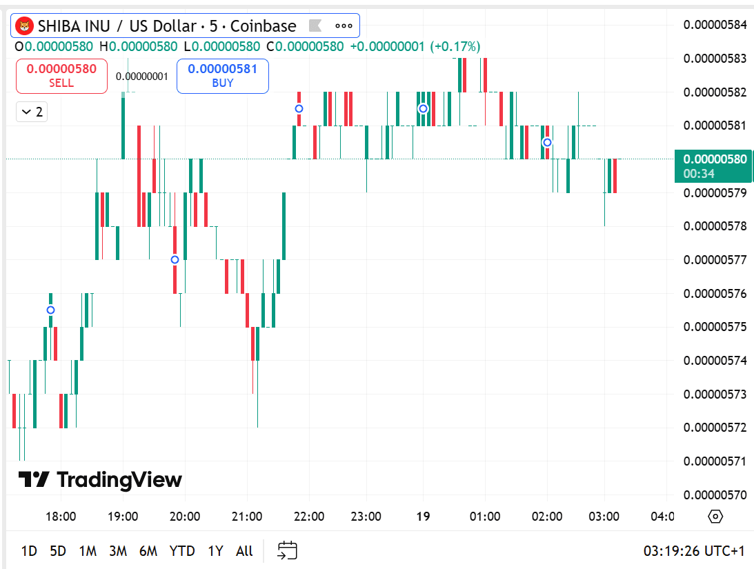 Shiba Inu is trading lower by 4.82% to $0.0000580. The market capitalization is valued at 3.41 billion dollars. The trading volume is valued at 165.38 million dollars, up 18.73%.