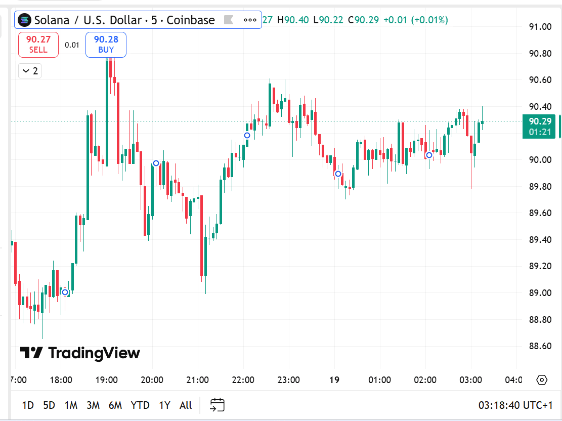 Solana is down 5.73% to $90.27 with a market cap of $51.3 billion and a trading volume of $4.33 billion, up 1.28% on the session. However, the volume resilience indicates that there is active trading. The price decline confirms that large-cap altcoins cannot escape the hawkish Fed environment.