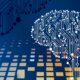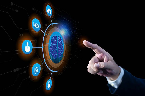 Businessman hand pointing at AI chip hologram with icons. digital hologram with AI chip and glowing icons, Futuristic technology transformation. business future digital world.
