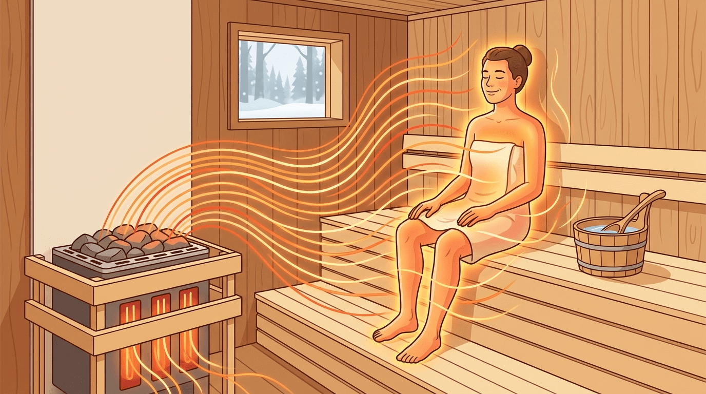 Convective heat transfers thermal energy through a fluid or gas, like the pressurized air of a sauna cabin. In standard Finnish saunas, pouring water over heated rocks rapidly raises the ambient air to 70–90°C. This mechanism forces the body to heat up from the outside in, creating a suffocating environment. This atmospheric middleman restricts how long an average person can safely endure the session.