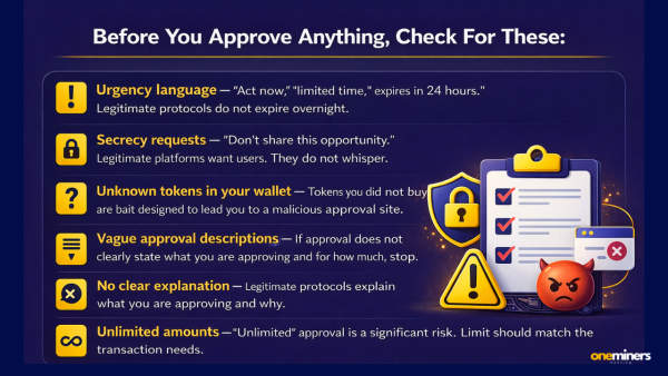- Vague approval descriptions — If the wallet popup does not clearly state what you are approving and for how much, stop. Read the details. If the details are unclear, do not approve.