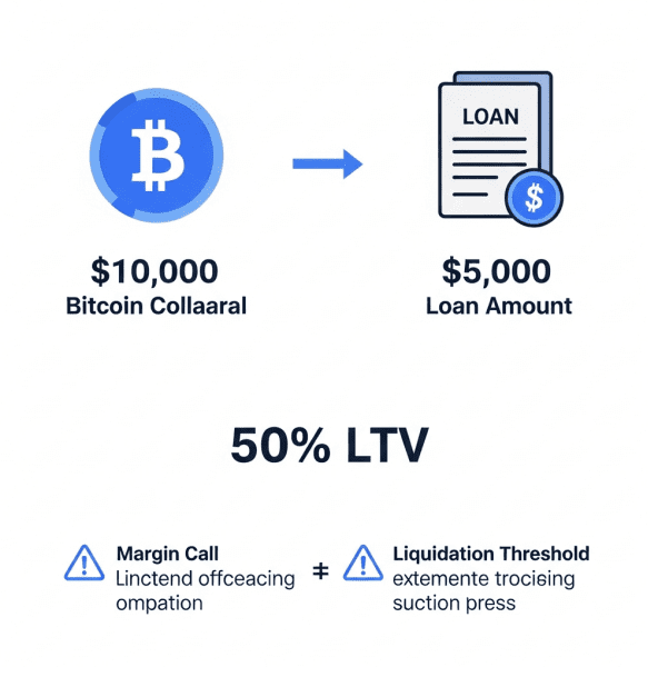 For example, depositing $10,000 worth of Bitcoin with a 50% LTV allows borrowing up to $5,000. This buffer helps protect lenders from volatility but introduces the possibility of margin calls if Bitcoin’s price decreases significantly.