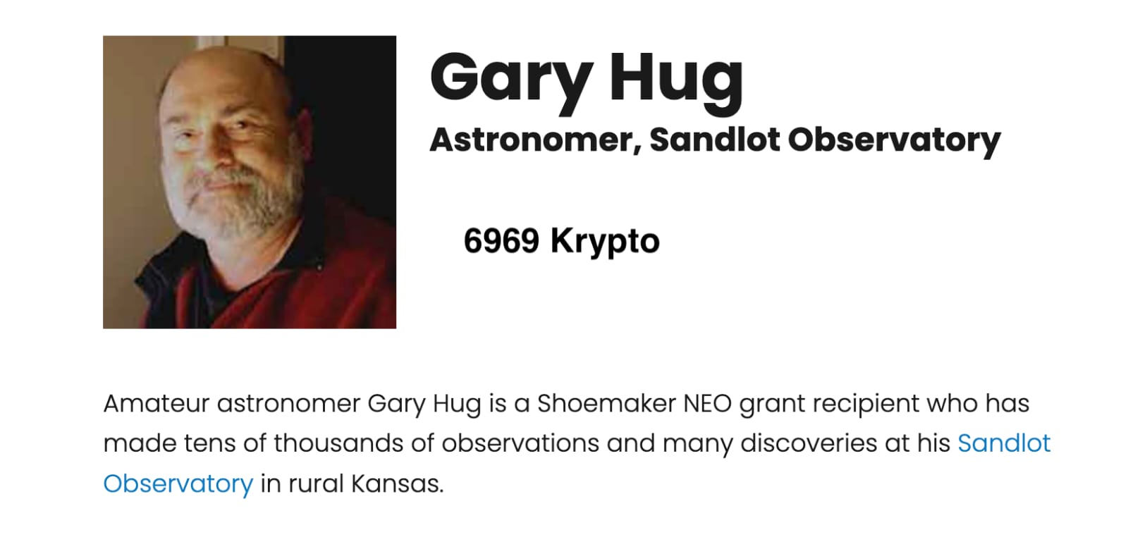 Gary Hug, the dedicated backyard astronomer operating Sandlot Observatory (H36) in rural Kansas, has added another achievement to his impressive record of minor planet discoveries. Hug has been credited with the discovery of a newly numbered asteroid, officially designated (6969) Krypto.