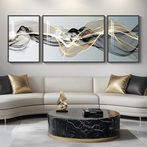 In high-end residential projects, gold accents frequently appear alongside marble, velvet, and dark timber. These combinations create contrast without visual noise. A large gold-toned abstract canvas above a fireplace anchors the room while drawing the eye upward. Interior architects often treat artwork as a structural component rather than a final accessory. This perspective ensures that art contributes to spatial planning from the outset.