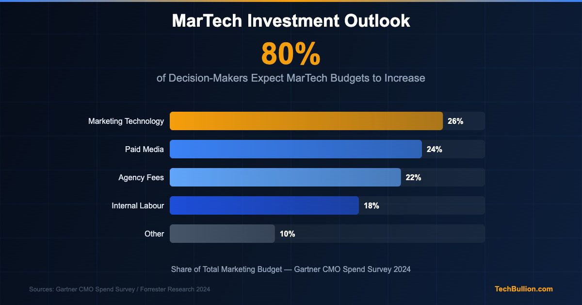 Marketing technology has become the single largest line item in many marketing budgets, and the trajectory of that investment shows no sign of reversing. According to Gartner’s annual CMO Spend Survey, marketing technology accounted for approximately 26 percent of total marketing budget allocation in 2024, ahead of paid media, agency fees, and internal labour costs. Across the broader market, approximately 80 percent of marketing technology decision-makers expect their budgets to increase over the next three to five years — a figure consistent with the broader momentum driving the $589 billion global MarTech market towards its projected $1.27 trillion valuation by 2031.