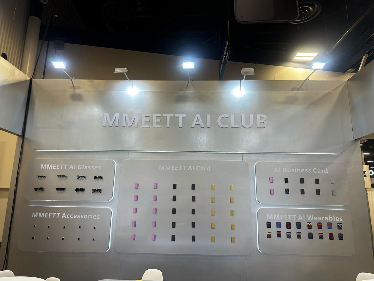 Picture Description: MMEETT’s product display at CES 2026 highlights its AI Business Card alongside other AI hardware concepts presented at the show.