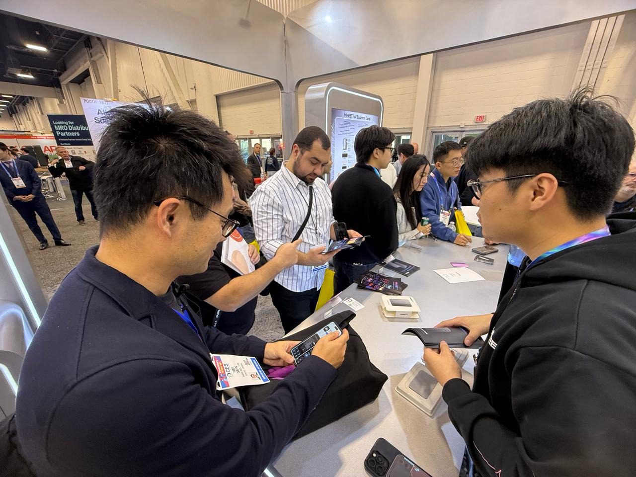 Picture Description: Attendees interact with the AI Business Card at MMEETT’s booth, accessing digital profiles and shared content through a tap-based exchange.