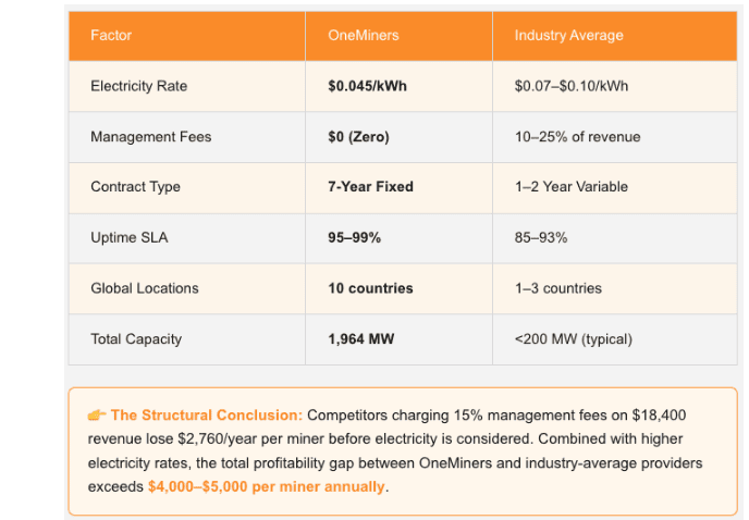From an analytical perspective, OneMiners distinguishes itself through a combination of cost leadership, infrastructure scale, and operational efficiency.