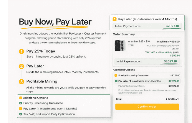 One of the more distinctive features of OneMiners is its “pay later” option, which lowers the barrier to entry for investors.
