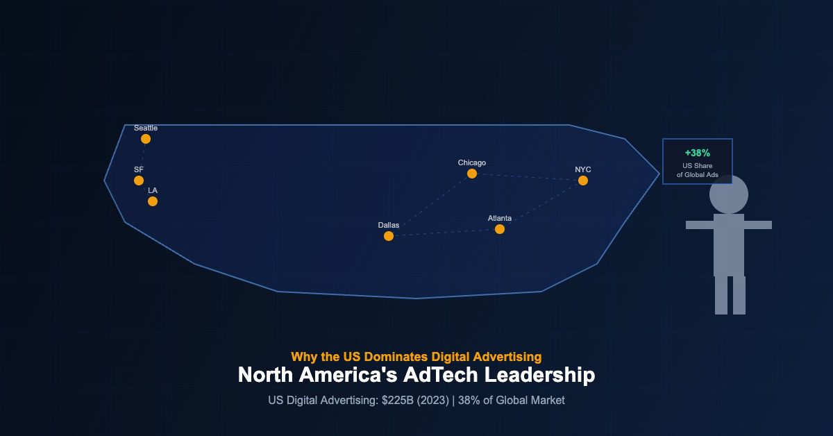 North America, led by the United States, accounts for approximately 38 per cent of global digital advertising spend, according to GroupM’s 2024 global advertising forecast. In absolute terms, the Interactive Advertising Bureau reported total US digital advertising revenue of $225 billion in 2023, a figure that exceeds the combined digital advertising markets of Western Europe and China when measured in US dollars at current exchange rates. Understanding why this dominance exists, and whether it is sustainable, requires examining the structural conditions that created it.