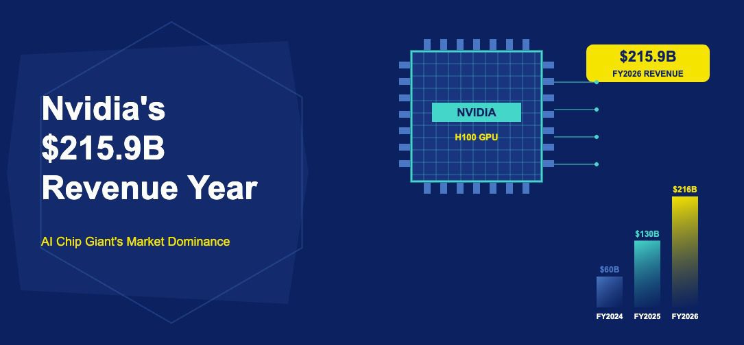 In a clean room on the outskirts of Taipei, a semiconductor fabrication line is producing the most sought-after pieces of silicon on the planet. These chips, designed by a company headquartered in Santa Clara, California, power the training and inference of virtually every major artificial intelligence system in operation today. That company is Nvidia, and in fiscal year 2026, it reported revenue of $215.9 billion, a figure that would have seemed fantastical even to the most optimistic analysts just three years ago. Nvidia has become not merely a chip company but the foundational infrastructure provider for the entire artificial intelligence economy, and its financial results serve as the most reliable barometer of global AI investment.
