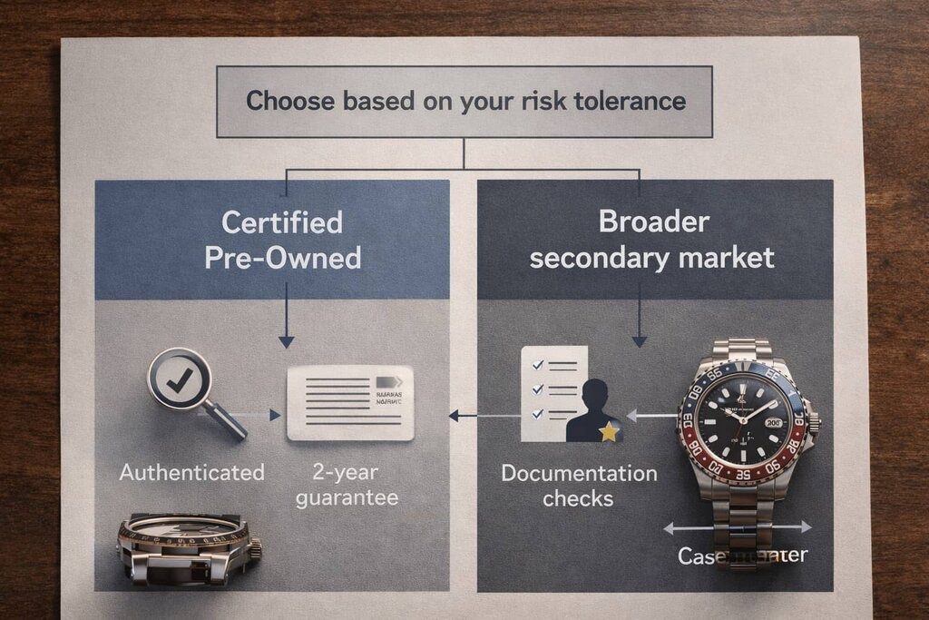 Rolex’s Certified Pre-Owned programme adds a parallel lane to the secondary market. Rolex states that Certified Pre-Owned watches must be at least two years old, are offered through official retailers in the programme, and get authenticated through Rolex’s network with verification of original configuration; Rolex also says these watches come with a new two-year international guarantee from the date of sale. =(Rolex Certified Pre-Owned Programme|2025);