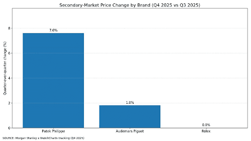 Not all gains carried the same meaning. Patek Philippe posted a 7.6% quarterly rise in Q4 2025, while Audemars Piguet rebounded more modestly, and Rolex stayed broadly flat over the same quarter in the WatchCharts-based view.