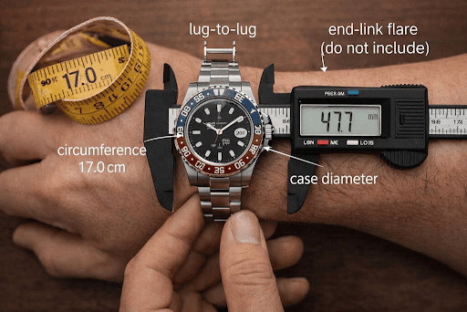 Here is the micro-scenario that keeps you honest: set the watch down, grab a caliper, and measure lug-to-lug in mm. Then compare it to your wrist circumference in cm, and sanity-check comfort before you chase a dial nickname. People often mis-measure by including the end-link flare; that small error can turn a “sure thing” into a watch that never leaves the box. Action: measure lug-to-lug and case diameter before you negotiate any price.