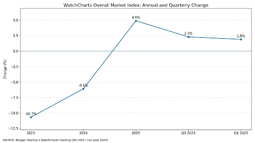 | WatchCharts Overall Market Index change | 2025: +4.9% | Stabilization returned, liquidity improved |