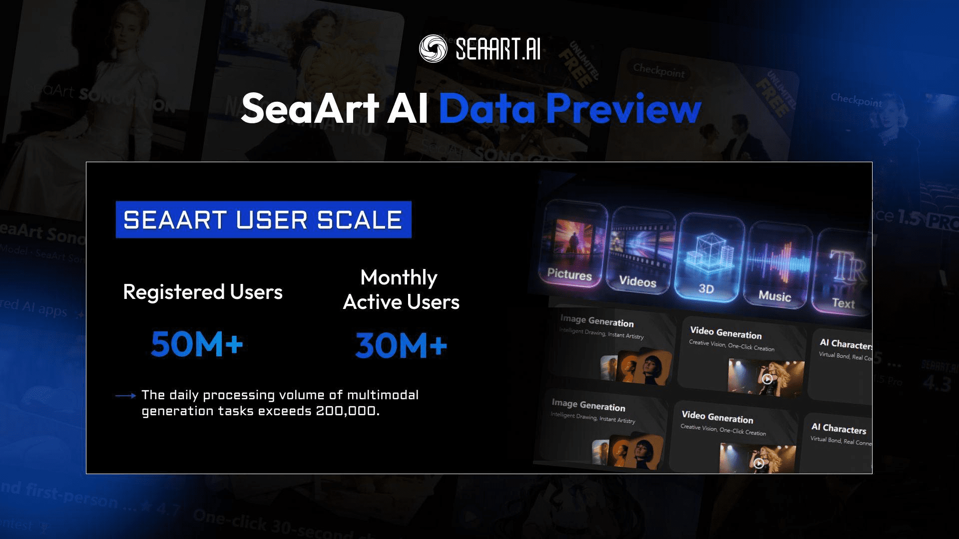 SeaArt has over 30 million MAU, 50+ million registered users, and an ARR of nearly $50 million. Users spend 3x longer on the platform than competitors, generating over 20 million images and 500,000 videos daily. These engagement datas demonstrate exceptional user stickiness and long-term growth potential.
