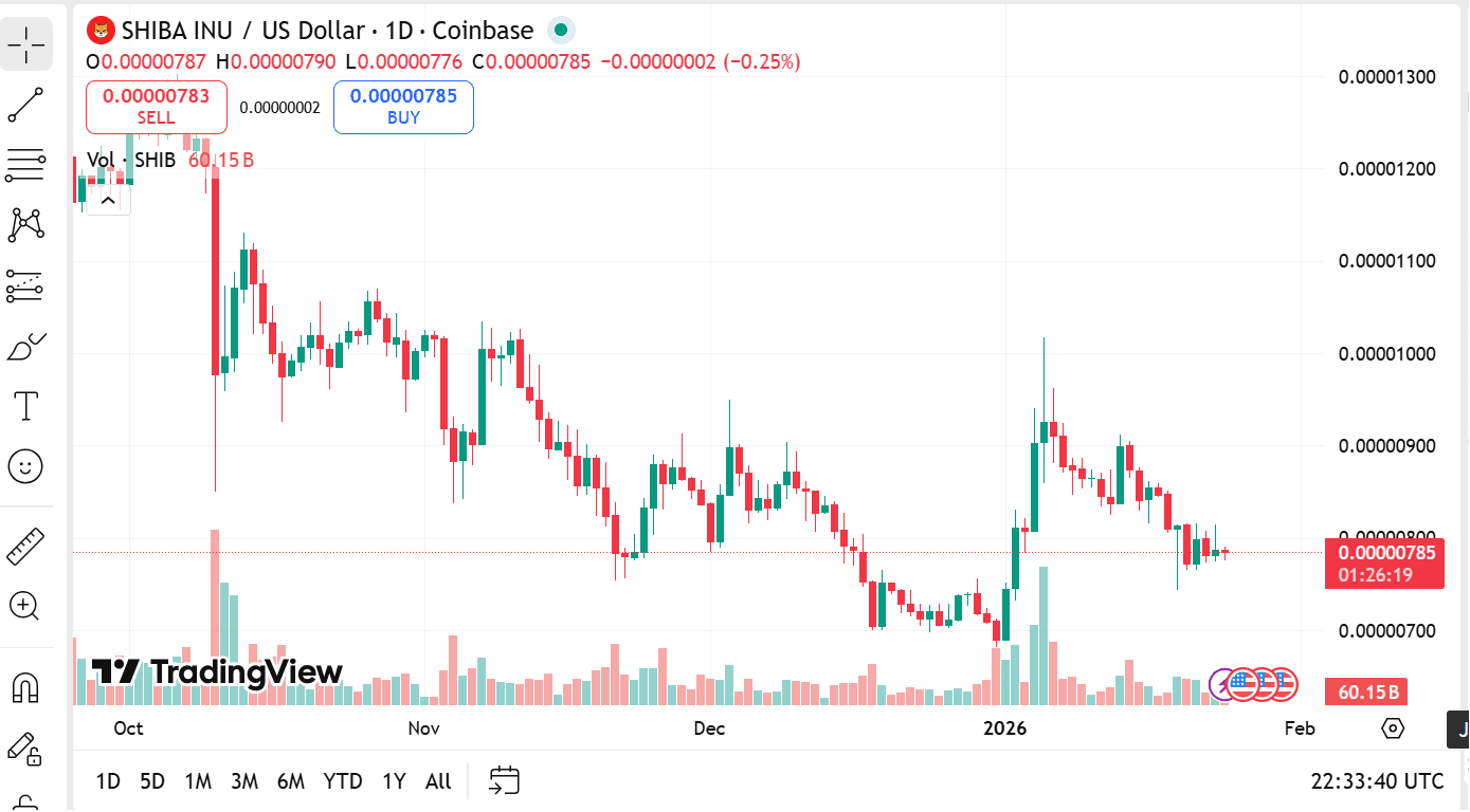 Price currently sits around $0.0000078 after consolidating from that move. The RSI reads 45, placing SHIB in neutral territory with room for appreciation. Open interest has recovered to approximately $87 million following a dip below $82 million earlier this month.