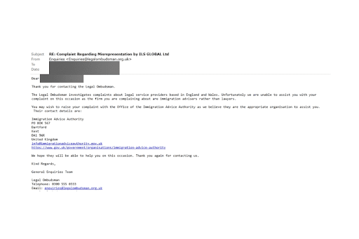 “Thank you for contacting the Legal Ombudsman. The Legal Ombudsman investigates complaints about legal service providers based in England and Wales. Unfortunately, we are unable to assist you with your complaint on this occasion as the firm you are complaining about are immigration advisers rather than lawyers.”