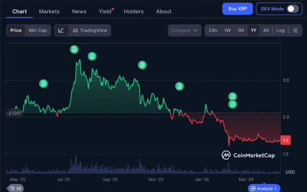 XRP whale wallets have absorbed over 1.2 billion tokens in 30 days while the price holds near $1.33, roughly 60% below its all-time high. The accumulation is the longest streak since the rally to $3.65, and the $5 target remains the number analysts keep circling for the second half of 2026. But while those whales wait for legislation and ETF inflows to move XRP, a portion of that same smart money is flowing into AlphaPepe, where Stage 13 is live at $0.01450, over $850,000 has been raised across 7,600 wallets, and the return math from here to analyst targets makes XRP’s 275% upside to $5 look like a savings account.