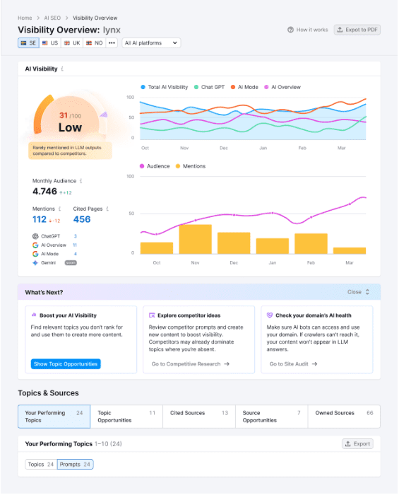 At the same time, the SEO Toolkit reinforces an essential truth: AI visibility still depends on SEO fundamentals. Entity-rich content, topic clusters, authority signals, and competitive intelligence remain the foundation that AI systems draw from.