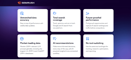 Managing AI visibility, SEO intelligence, and content optimization in separate tools creates friction. Semrush One brings these capabilities together in a single workspace.