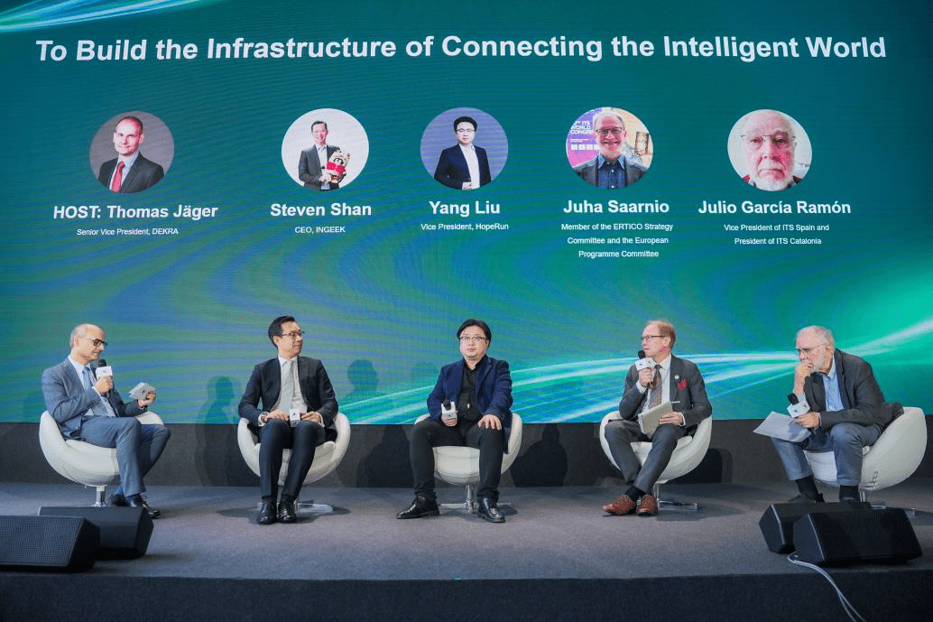 To conclude the forum, moderated by Thomas Jäger, Senior Vice President of DEKRA, a compelling roundtable discussion bringing together global wisdom took place. Distinguished guests from INGEEK, HopeRun Software, the Strategy Committee of ERTICO-ITS Europe and ITS Spain engaged in an in-depth dialogue and ideological exchange centering on building the connectivity infrastructure for an intelligent world.
