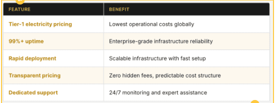 The platform enables rapid deployment, allowing miners to scale quickly with minimal setup time, and maintains full pricing transparency with no hidden fees, ensuring a predictable cost structure. In addition, dedicated 24/7 support provides continuous monitoring and expert assistance.