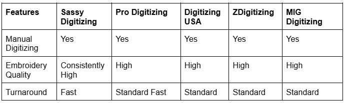 This comparison shows how these providers offer embroidery digitizing services, where Sassy Digitizing (Overall Best Embroidery Digitizing Services Providers in the USA) provides the most balanced quality, affordability, and service.
