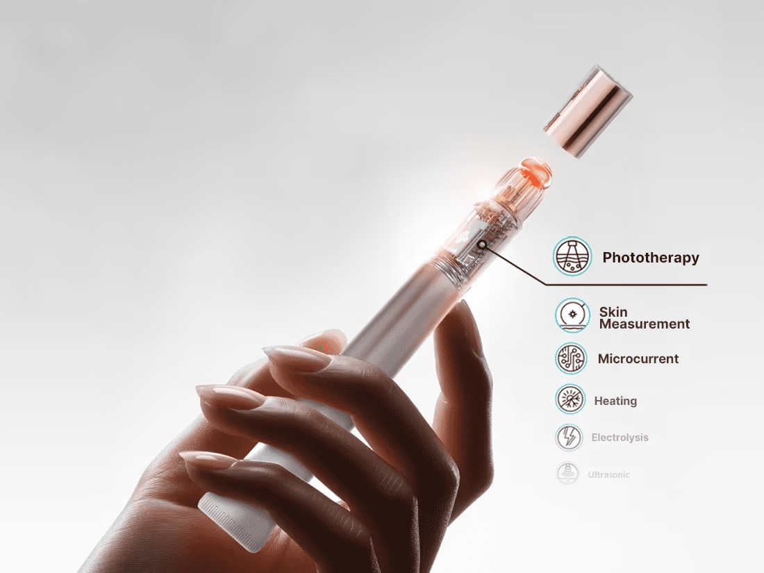 The first pillar integrates LED-based phototherapy directly into applicator heads. By combining red and blue light therapy with topical application, treatment begins at the same moment the product touches the skin. This approach aligns formulation delivery with light-based stimulation, reducing friction between treatment steps and encouraging consistent usage in daily routines.