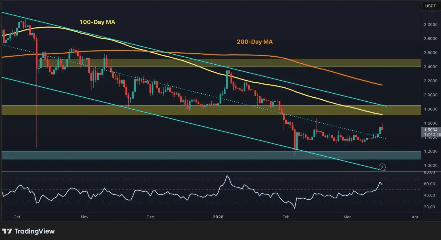 XRP is trading near $1.50, recovering from the $1.10 to $1.20 support zone that held through recent sessions, according to CoinMarketCap. Fundamentals show that the RSI is improving. And while that might signal strengthening short-term momentum, the bigger picture is more cautious.