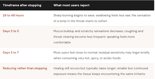The good news is that recovery follows a predictable and relatively short timeline. Most users experience clear improvement within 48 to 72 hours of reducing or pausing their use and near-complete resolution within a week. The mucosal lining of the throat is resilient; it responds well to reduced exposure, consistent hydration, and simple supportive measures like saltwater gargles and honey.